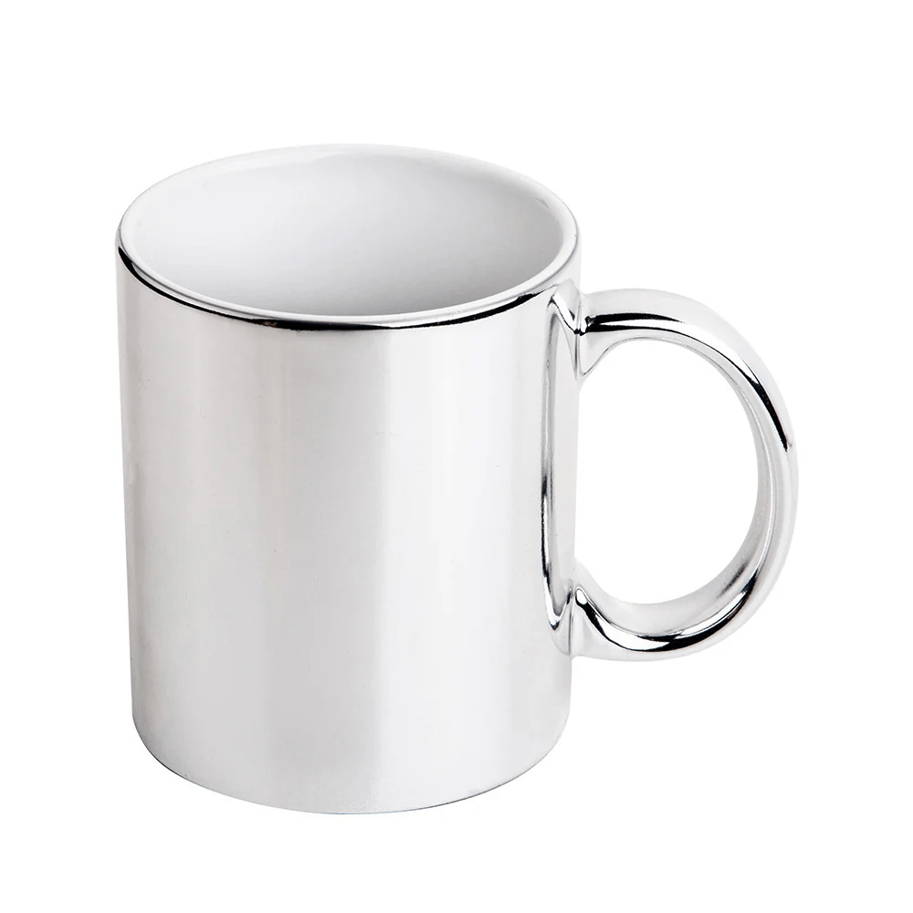 Exklusive 330-ml-Keramik-Tasse mit eleganter Plating Silberverspiegelung. Es handelt sich um ein einzigartiges Premium-Produkt, das mit Hilfe der Sublimationstechnologie personalisiert werden kann.